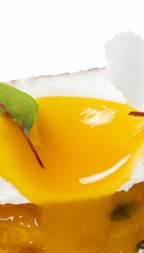 Crème (crème, stabilisants : carraghénanes), noix de coco, mangue, sucre, Blancs d’oeufs pasteurisés (blanc d’oeuf, stabilisant : gomme de guar, gomme de xanthane), Sucre glace (sucre, fécule de pomme de terre), Fruit de la passion, Chocolat blanc (beurre de cacao, LAIT entier en poudre, sucre, émulsifiant: lécithine de tournesol, extrait naturel de vanille), Noix de coco rapée, Sirop de glucose, Eau, Gélatine bovine, Gélifiant : Pectines, vene cress, Zestes de citron vert.