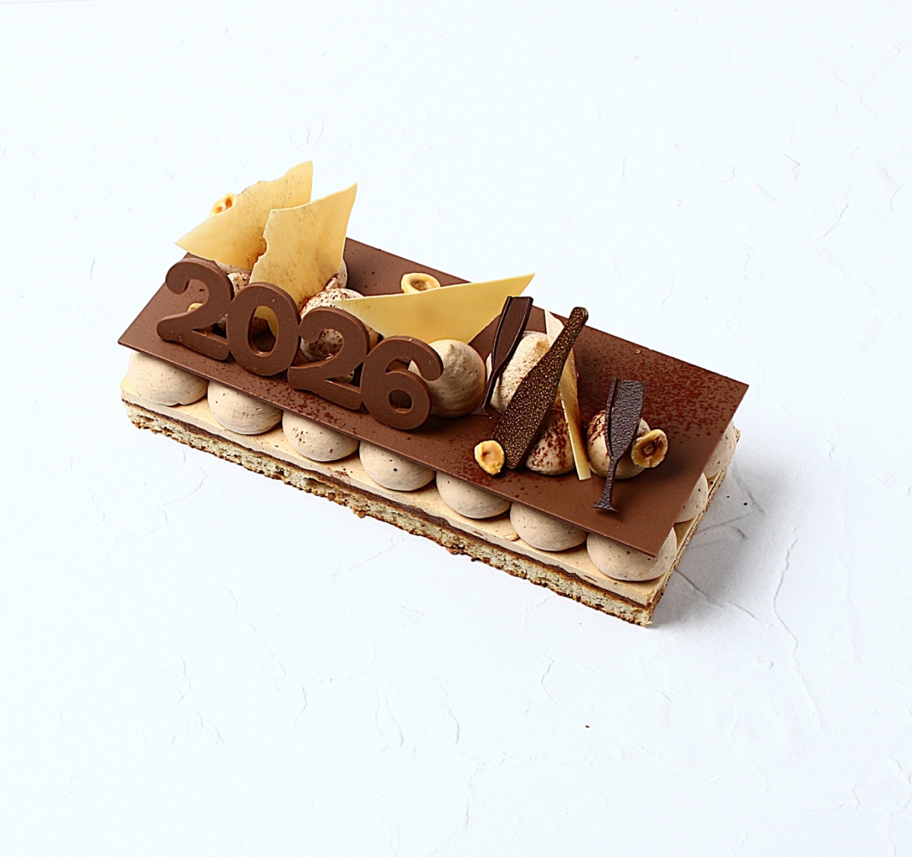 Biscuit dacquoise à la noisette, croustillant praliné, mousse praliné noisette, chantilly chocolat au lait.