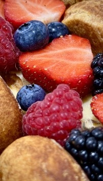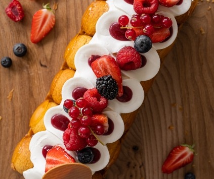 Pâte feuilletée caramélisée, pâte à choux, crème pâtissière vanille, chantilly fleur de sureau, fruits rouges frais (fraises, myrtilles, mûres, framboises).