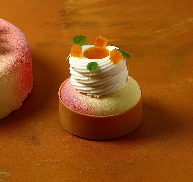 Sous sa mousse légère au citron vert et yuzu, se cachent un crémeux mangue, un confit ananas–mangue, et un biscuit moelleux posé sur un sablé Normand croustillant au citron vert.